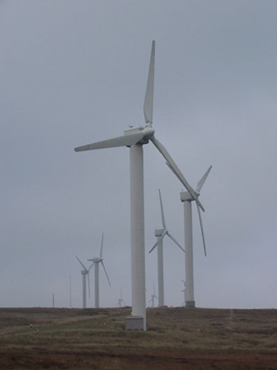 High on the moors above Ogden Water is the Ovenden Moor Windfarm. Perhaps the single most visible symbol of mans impact on the local environment, as it can be observed for miles around. The windfarm has been in operation since June 1993 when "Yorkshire Windpower Ltd", a joint venture between Yorkshire Water and Yorkshire Electricity, built the farm on water catchment land owned by Yorkshire Water. The 9.2 MW windfarm has 23 wind turbines, producing enough electricity for about 7,500 homes. The power is fed directly into the national grid. The wind turbines themselves were manufactured in Denmark by "Vestas", a world leader in wind turbine technology, though the turbine towers were manufactured locally in Leeds. The towers are a rigid tubular structure standing on a reinforced concrete foundation weighing about 250 tonnes. The wind turbine generators are housed within the boxlike structure, called a nacelle, at the top of the 32 meter high towers. The nacelle also contains a gearbox which maintains the output of the generators at a constant rate. Each of the wind turbines has three 17 metre long fibreglass reinforced polyester blades rotating at 35 revolutions per minute. The turbines begin generating power when the wind reaches 11mph, with maximum output achieved at 29mph. At 56 mph the turbines shut down for safety reasons. The wind turbines are arranged in two lines to make the best of the prevailing south-westerly winds. Each turbine is fully computerised to allow it to find the best output independently of its neighbour, although a further two anemometry masts provide further information on wind speeds generally across the site. For environmental reasons the power from the windfarm is taken underground to a substation at Denholme via a 11KV cable. All about Ogden 2005 - Courtesy of D. Wilson. Update 2011: The wind farm has been in operation since June 1993 and was completed with financial assistance from the European Union under its Thermie programme, which aimed to support the development of 'green' technologies. The wind farm is owned by Yorkshire Windpower Limited, a 50/50 joint venture between E.ON UK Renewables and Energy Power Resources Limited (EPRL). Situated 440m above sea level, the turbines are set out in two lines forming a 'V' shape, to make best use of the prevailing south westerly wind. Ovenden Moor Wind Farm generates enough electricity to meet the average domestic needs of over 5000 households, displacing 10396 tonnes of carbon dioxide emissions annually. On top of that, it also saves 91 tonnes of sulphur dioxide and 30 tonnes of oxides of nitrogen emissions annually. |